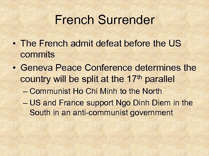 French Surrender • The French admit defeat before the US commits • Geneva Peace Conference determines the country will be split at the 17 th parallel – Communist Ho Chi Minh to the North – US and France support Ngo Dinh Diem in the South in an anti-communist government