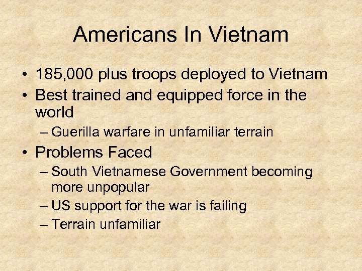 Americans In Vietnam • 185, 000 plus troops deployed to Vietnam • Best trained and equipped force in the world – Guerilla warfare in unfamiliar terrain • Problems Faced – South Vietnamese Government becoming more unpopular – US support for the war is failing – Terrain unfamiliar