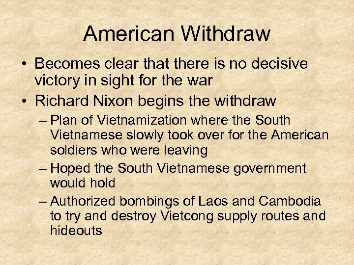 American Withdraw • Becomes clear that there is no decisive victory in sight for the war • Richard Nixon begins the withdraw – Plan of Vietnamization where the South Vietnamese slowly took over for the American soldiers who were leaving – Hoped the South Vietnamese government would hold – Authorized bombings of Laos and Cambodia to try and destroy Vietcong supply routes and hideouts