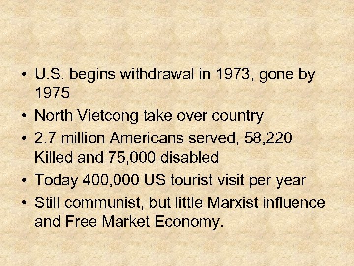• U. S. begins withdrawal in 1973, gone by 1975 • North Vietcong take over country • 2. 7 million Americans served, 58, 220 Killed and 75, 000 disabled • Today 400, 000 US tourist visit per year • Still communist, but little Marxist influence and Free Market Economy.