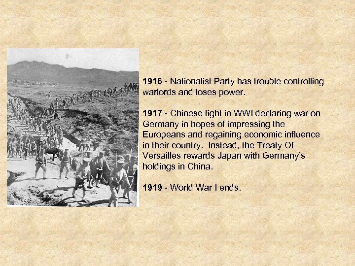 1916 - Nationalist Party has trouble controlling warlords and loses power. 1917 - Chinese fight in WWI declaring war on Germany in hopes of impressing the Europeans and regaining economic influence in their country. Instead, the Treaty Of Versailles rewards Japan with Germany’s holdings in China. 1919 - World War I ends.