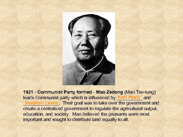 1921 - Communist Party formed - Mao Zedong (Mao Tse-tung) Karl Marx leads Communist party which is influenced by _____ and Vladimir Lenin _______. Their goal was to take over the government and create a centralized government to regulate the agricultural output, education, and society. Mao believed the peasants were most important and sought to distribute land equally to all.