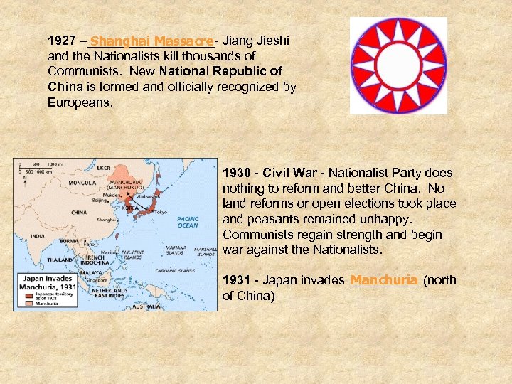 1927 –_________- Jiang Jieshi Shanghai Massacre and the Nationalists kill thousands of Communists. New National Republic of China is formed and officially recognized by Europeans. 1930 - Civil War - Nationalist Party does nothing to reform and better China. No land reforms or open elections took place and peasants remained unhappy. Communists regain strength and begin war against the Nationalists. Manchuria 1931 - Japan invades _____ (north of China)