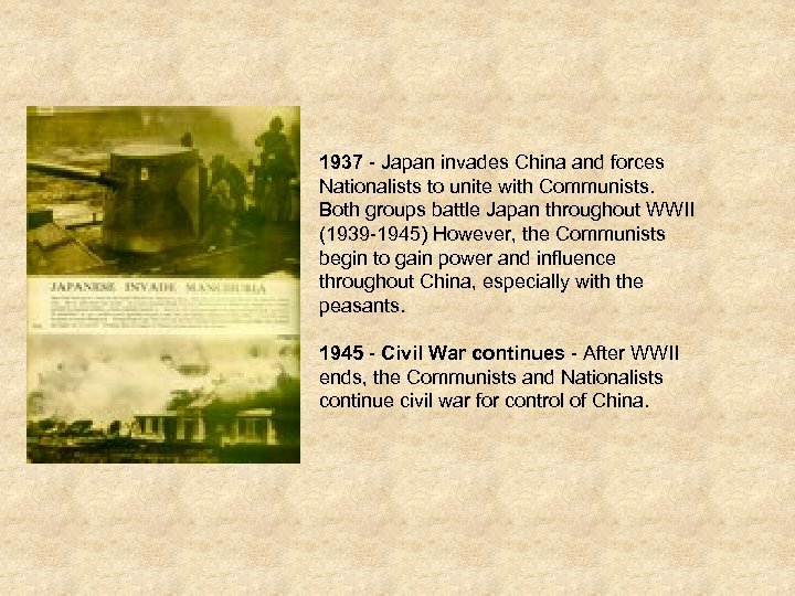 1937 - Japan invades China and forces Nationalists to unite with Communists. Both groups battle Japan throughout WWII (1939 -1945) However, the Communists begin to gain power and influence throughout China, especially with the peasants. 1945 - Civil War continues - After WWII ends, the Communists and Nationalists continue civil war for control of China.