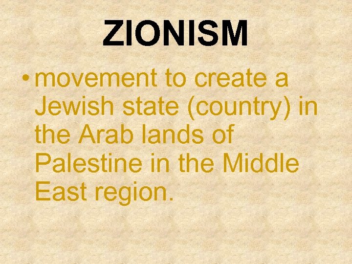 ZIONISM • movement to create a Jewish state (country) in the Arab lands of Palestine in the Middle East region.