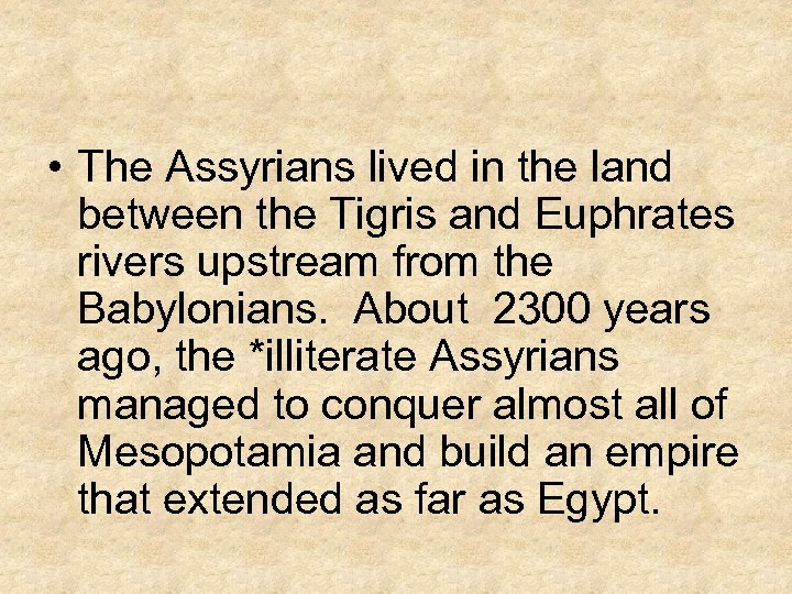 • The Assyrians lived in the land between the Tigris and Euphrates rivers upstream from the Babylonians. About 2300 years ago, the *illiterate Assyrians managed to conquer almost all of Mesopotamia and build an empire that extended as far as Egypt.