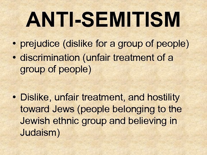 ANTI-SEMITISM • prejudice (dislike for a group of people) • discrimination (unfair treatment of a group of people) • Dislike, unfair treatment, and hostility toward Jews (people belonging to the Jewish ethnic group and believing in Judaism)