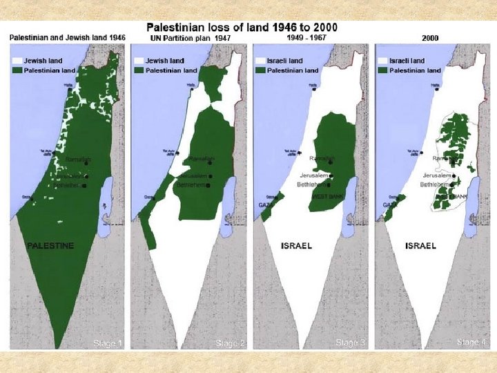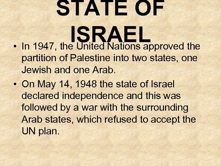 STATE OF ISRAEL • In 1947, the United Nations approved the partition of Palestine into two states, one Jewish and one Arab. • On May 14, 1948 the state of Israel declared independence and this was followed by a war with the surrounding Arab states, which refused to accept the UN plan.