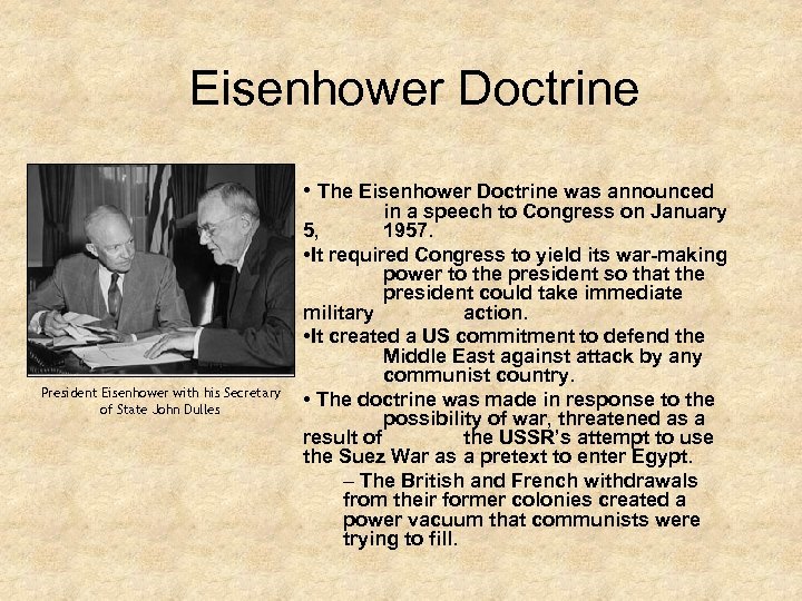 Eisenhower Doctrine • The Eisenhower Doctrine was announced President Eisenhower with his Secretary of State John Dulles in a speech to Congress on January 5, 1957. • It required Congress to yield its war-making power to the president so that the president could take immediate military action. • It created a US commitment to defend the Middle East against attack by any communist country. • The doctrine was made in response to the possibility of war, threatened as a result of the USSR’s attempt to use the Suez War as a pretext to enter Egypt. – The British and French withdrawals from their former colonies created a power vacuum that communists were trying to fill.