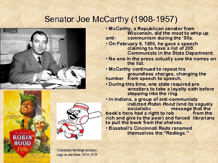 Senator Joe Mc. Carthy (1908 -1957) • Mc. Carthy, a Republican senator from Wisconsin, did the most to whip up anticommunism during the ‘ 50 s. • On February 9, 1950, he gave a speech claiming to have a list of 205 Communists in the State Department. • No one in the press actually saw the names on the list. • Mc. Carthy continued to repeat his groundless charges, changing the number from speech to speech. • During this time, one state required pro wrestlers to take a loyalty oath before stepping into the ring. • In Indiana, a group of anti-communists indicted Robin Hood (and its vaguely socialistic message that the book's hero had a right to rob from the rich and give to the poor) and forced librarians to pull the book from the shelves. • Baseball's Cincinnati Reds renamed themselves the "Redlegs. " Cincinnati Redlegs primary logo in use from 1954 -1959