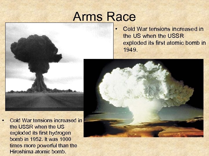 Arms Race • Cold War tensions increased in the US when the USSR exploded its first atomic bomb in 1949. • Cold War tensions increased in the USSR when the US exploded its first hydrogen bomb in 1952. It was 1000 times more powerful than the Hiroshima atomic bomb.