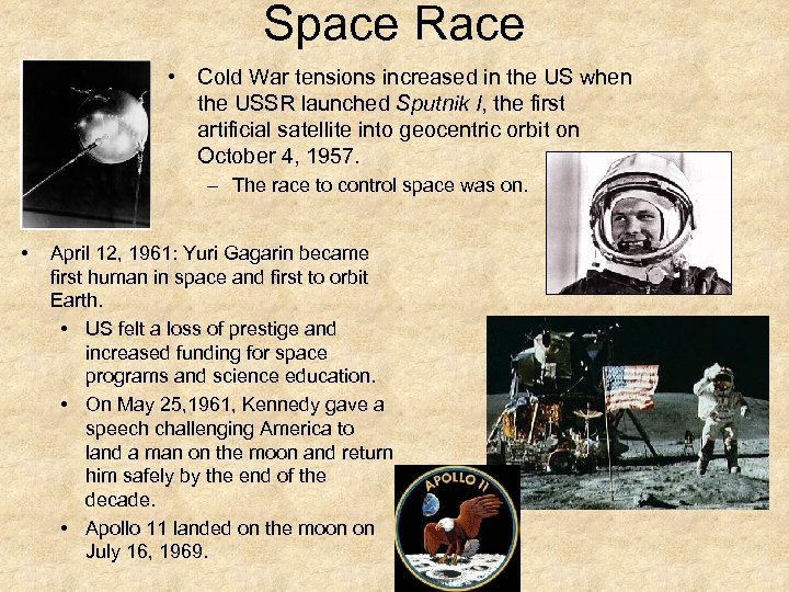 Space Race • Cold War tensions increased in the US when the USSR launched Sputnik I, the first artificial satellite into geocentric orbit on October 4, 1957. – The race to control space was on. • April 12, 1961: Yuri Gagarin became first human in space and first to orbit Earth. • US felt a loss of prestige and increased funding for space programs and science education. • On May 25, 1961, Kennedy gave a speech challenging America to land a man on the moon and return him safely by the end of the decade. • Apollo 11 landed on the moon on July 16, 1969.