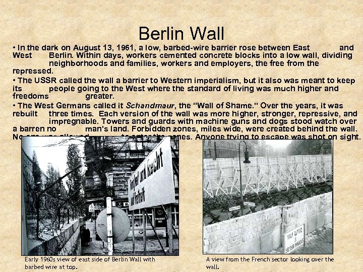 Berlin Wall • In the dark on August 13, 1961, a low, barbed-wire barrier rose between East and West Berlin. Within days, workers cemented concrete blocks into a low wall, dividing neighborhoods and families, workers and employers, the free from the repressed. • The USSR called the wall a barrier to Western imperialism, but it also was meant to keep its people going to the West where the standard of living was much higher and freedoms greater. • The West Germans called it Schandmaur, the "Wall of Shame. " Over the years, it was rebuilt three times. Each version of the wall was more higher, stronger, repressive, and impregnable. Towers and guards with machine guns and dogs stood watch over a barren no man's land. Forbidden zones, miles wide, were created behind the wall. No one was allowed to enter the zones. Anyone trying to escape was shot on sight. Early 1960 s view of east side of Berlin Wall with barbed wire at top. A view from the French sector looking over the wall.