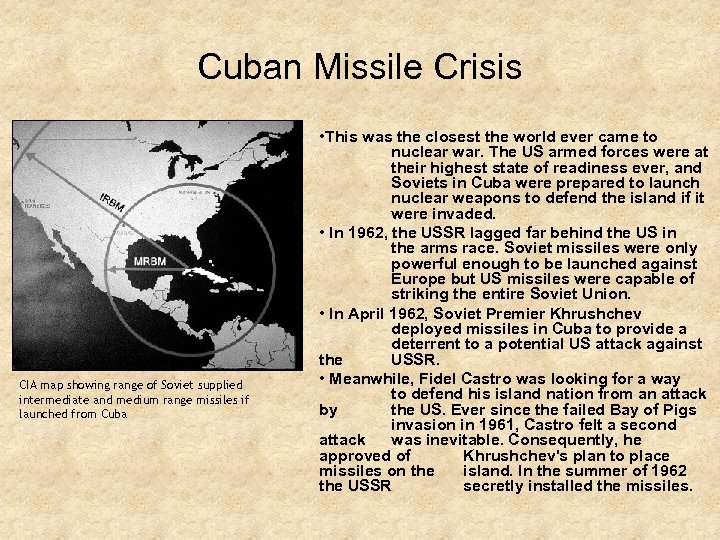 Cuban Missile Crisis CIA map showing range of Soviet supplied intermediate and medium range missiles if launched from Cuba • This was the closest the world ever came to nuclear war. The US armed forces were at their highest state of readiness ever, and Soviets in Cuba were prepared to launch nuclear weapons to defend the island if it were invaded. • In 1962, the USSR lagged far behind the US in the arms race. Soviet missiles were only powerful enough to be launched against Europe but US missiles were capable of striking the entire Soviet Union. • In April 1962, Soviet Premier Khrushchev deployed missiles in Cuba to provide a deterrent to a potential US attack against the USSR. • Meanwhile, Fidel Castro was looking for a way to defend his island nation from an attack by the US. Ever since the failed Bay of Pigs invasion in 1961, Castro felt a second attack was inevitable. Consequently, he approved of Khrushchev's plan to place missiles on the island. In the summer of 1962 the USSR secretly installed the missiles.