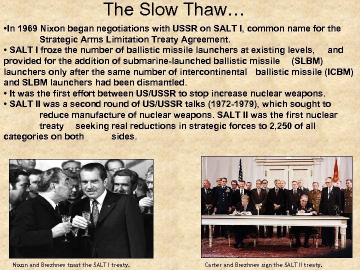 The Slow Thaw… • In 1969 Nixon began negotiations with USSR on SALT I, common name for the Strategic Arms Limitation Treaty Agreement. • SALT I froze the number of ballistic missile launchers at existing levels, and provided for the addition of submarine-launched ballistic missile (SLBM) launchers only after the same number of intercontinental ballistic missile (ICBM) and SLBM launchers had been dismantled. • It was the first effort between US/USSR to stop increase nuclear weapons. • SALT II was a second round of US/USSR talks (1972 -1979), which sought to reduce manufacture of nuclear weapons. SALT II was the first nuclear treaty seeking real reductions in strategic forces to 2, 250 of all categories on both sides. Nixon and Brezhnev toast the SALT I treaty. Carter and Brezhnev sign the SALT II treaty.