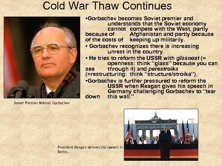 Cold War Thaw Continues • Gorbachev becomes Soviet premier and understands that the Soviet economy cannot compete with the West, partly because of Afghanistan and partly because of the costs of keeping up militarily. • Gorbachev recognizes there is increasing unrest in the country. • He tries to reform the USSR with glasnost (= openness: think “glass” because you can see through it) and perestroika (=restructuring: think “structure/stroika”). • Gorbachev is further pressured to reform the USSR when Reagan gives his speech in Germany challenging Gorbachev to “tear down this wall. ” Soviet Premier Mikhail Gorbachev President Reagan delivers his speech in Berlin.
