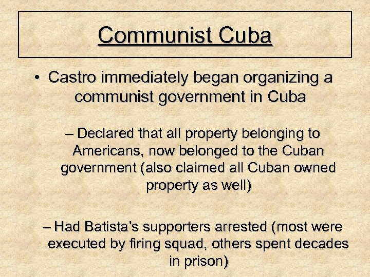 Communist Cuba • Castro immediately began organizing a communist government in Cuba – Declared that all property belonging to Americans, now belonged to the Cuban government (also claimed all Cuban owned property as well) – Had Batista’s supporters arrested (most were executed by firing squad, others spent decades in prison)
