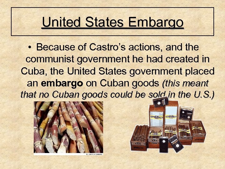 United States Embargo • Because of Castro’s actions, and the communist government he had created in Cuba, the United States government placed an embargo on Cuban goods (this meant that no Cuban goods could be sold in the U. S. )