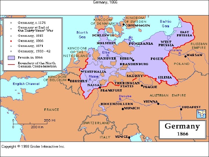 AUSTRO-PRUSSIAN WAR--1866 • quick defeat of Austria (aka Seven Weeks War) • Bismarck formed the North German Confederation without Austria and with Prussian leadership FRANCO-PRUSSIAN WAR 1870 -71 • Exploited German states’ fears of France to ally with Prussia • France humiliatingly defeated, Alsace. Lorraine annexed