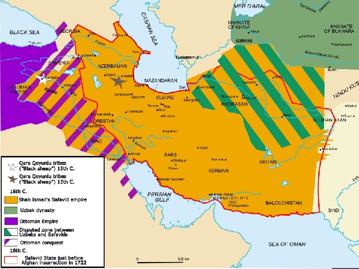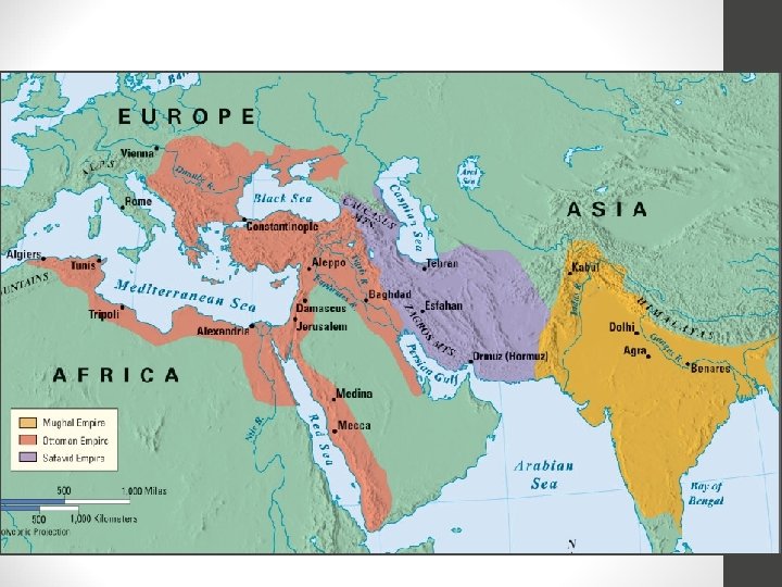 Safavid • Members of an Islamic brotherhood joined Shi’a Muslims • Isma’il (1499) • Leader of army – 14 yrs old • Fought Ottomans (Sunni Muslim) • • Destroyed Sunni population in Baghdad Selim the Grim responded by killing nearly 40, 000 Shi’a Muslims Qizilbash – “redheads” – calvalry armed with swords and knives No Navy was every built • Fighting still continues today