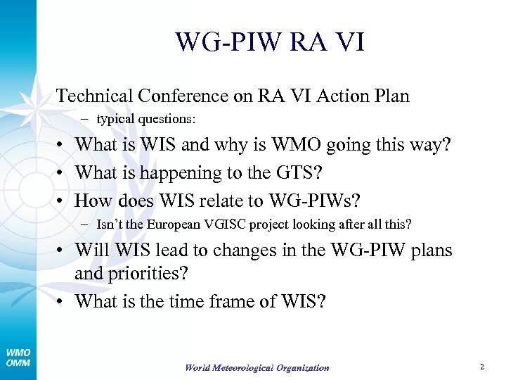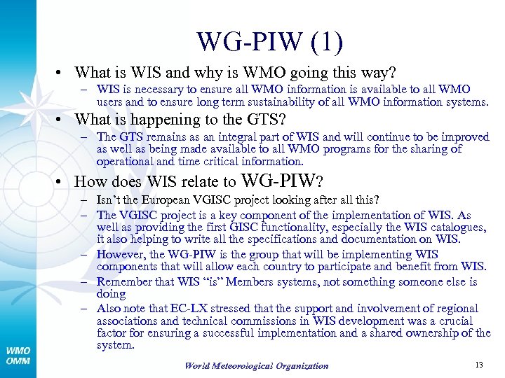 WG-PIW RA VI Technical Conference on RA VI Action Plan – typical questions: • What is WIS and why is WMO going this way? • What is happening to the GTS? • How does WIS relate to WG-PIWs? – Isn’t the European VGISC project looking after all this? • Will WIS lead to changes in the WG-PIW plans and priorities? • What is the time frame of WIS? World Meteorological Organization 2