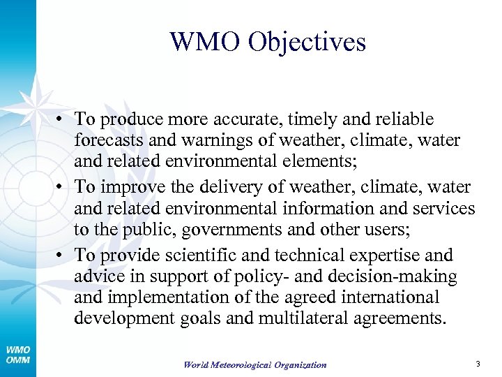 WMO Objectives • To produce more accurate, timely and reliable forecasts and warnings of weather, climate, water and related environmental elements; • To improve the delivery of weather, climate, water and related environmental information and services to the public, governments and other users; • To provide scientific and technical expertise and advice in support of policy- and decision-making and implementation of the agreed international development goals and multilateral agreements. World Meteorological Organization 3