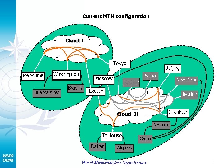 Current MTN configuration Cloud I Tokyo Melbourne Washington Buenos Aires Sofia Moscow Brasilia Beijing New Delhi Prague Exeter Jeddah Offenbach Cloud II Nairobi Toulouse Dakar Cairo Algiers World Meteorological Organization 8