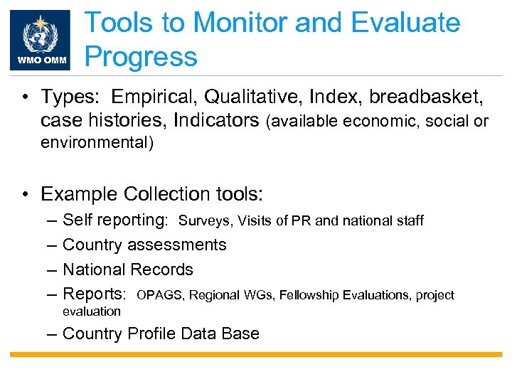 WMO OMM Tools to Monitor and Evaluate Progress • Types: Empirical, Qualitative, Index, breadbasket, case histories, Indicators (available economic, social or environmental) • Example Collection tools: – – Self reporting: Surveys, Visits of PR and national staff Country assessments National Records Reports: OPAGS, Regional WGs, Fellowship Evaluations, project evaluation – Country Profile Data Base