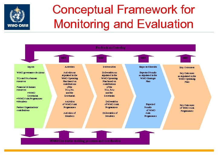WMO OMM Conceptual Framework for Monitoring and Evaluation Feedback and learning M&E M&E Inputs Activities Deliverables Expected Results Key Outcomes WMO governance decisions Activities as stipulated in the WMO Operating Plan based on contributions of the TCs, RA and the Secretariat Deliverables as stipulated in the WMO Operating Plan based on contributions of the TCs, RAs and the Secretariat Expected Results as stipulated in the WMO Strategic Plan Key Outcomes as stipulated in the WMO Operating Plan TCs and RAs human resources Financial & human resources: ·WMO Secretariat ·WMO Joint Programmes ·Members Partner Organizations’ contributions Activities of WMO Joint Programmes Activities of Members Deliverables of WMO Joint Programmes Deliverables of Members WMO Secretariat enabling processes and coordination Expected Results of WMO Joint Programmes Key Outcomes of WMO Joint Programmes