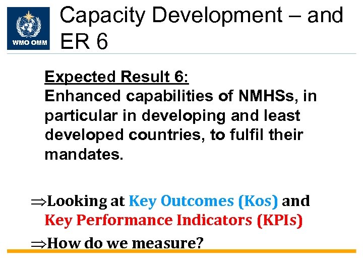 WMO OMM Capacity Development – and ER 6 Expected Result 6: Enhanced capabilities of NMHSs, in particular in developing and least developed countries, to fulfil their mandates. ÞLooking at Key Outcomes (Kos) and Key Performance Indicators (KPIs) ÞHow do we measure?