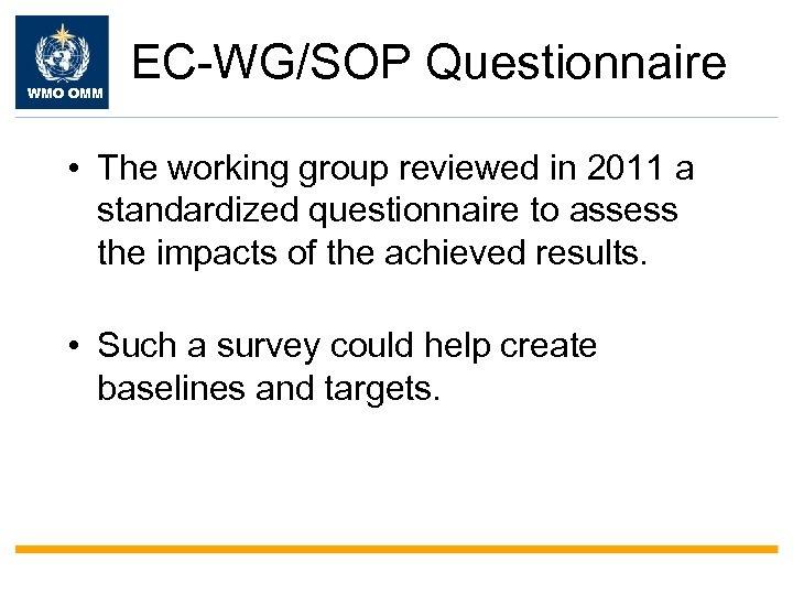 WMO OMM EC-WG/SOP Questionnaire • The working group reviewed in 2011 a standardized questionnaire to assess the impacts of the achieved results. • Such a survey could help create baselines and targets.