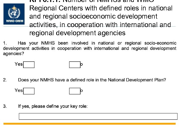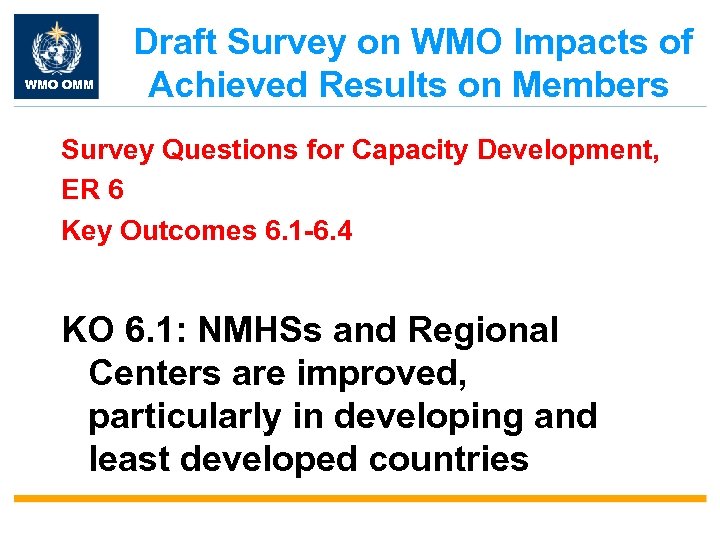WMO OMM Draft Survey on WMO Impacts of Achieved Results on Members Survey Questions for Capacity Development, ER 6 Key Outcomes 6. 1 -6. 4 KO 6. 1: NMHSs and Regional Centers are improved, particularly in developing and least developed countries