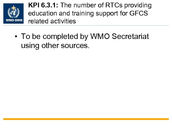 WMO OMM KPI 6. 3. 1: The number of RTCs providing education and training support for GFCS related activities • To be completed by WMO Secretariat using other sources.
