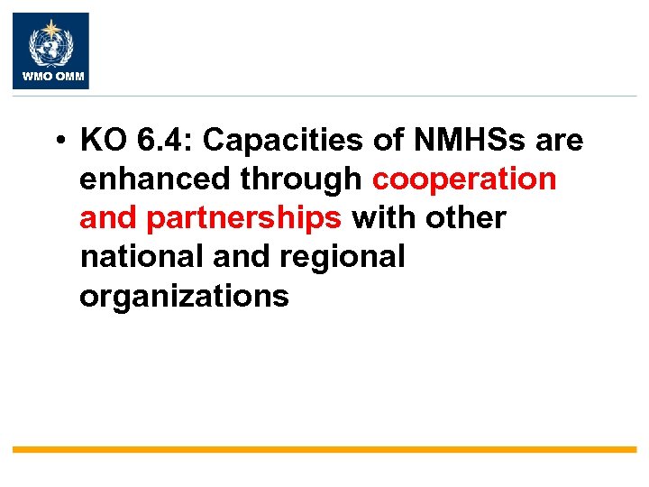 WMO OMM • KO 6. 4: Capacities of NMHSs are enhanced through cooperation and partnerships with other national and regional organizations