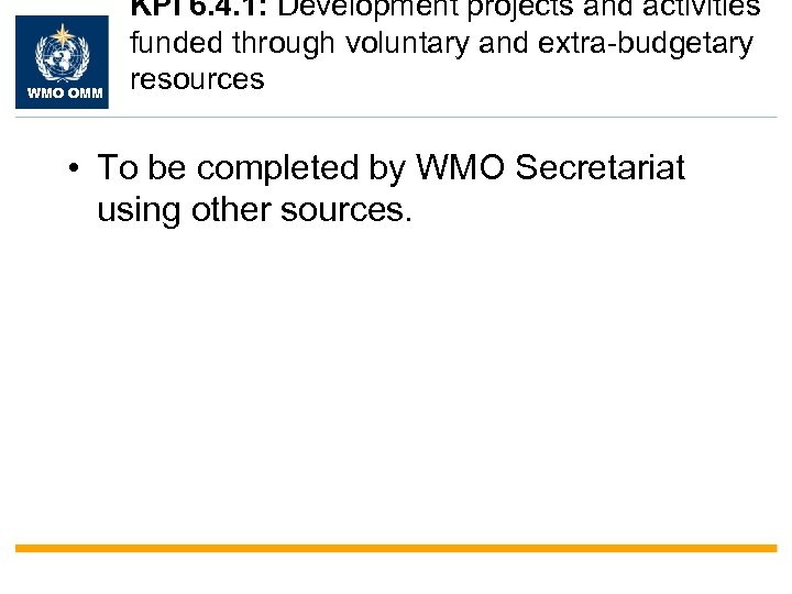 WMO OMM KPI 6. 4. 1: Development projects and activities funded through voluntary and extra-budgetary resources • To be completed by WMO Secretariat using other sources.
