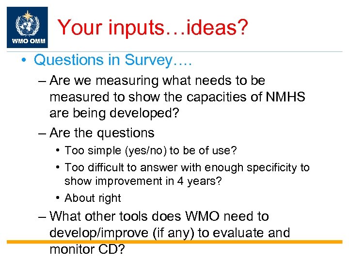 WMO OMM Your inputs…ideas? • Questions in Survey…. – Are we measuring what needs to be measured to show the capacities of NMHS are being developed? – Are the questions • Too simple (yes/no) to be of use? • Too difficult to answer with enough specificity to show improvement in 4 years? • About right – What other tools does WMO need to develop/improve (if any) to evaluate and monitor CD?