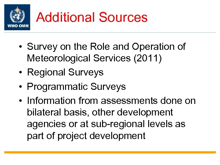 WMO OMM Additional Sources • Survey on the Role and Operation of Meteorological Services (2011) • Regional Surveys • Programmatic Surveys • Information from assessments done on bilateral basis, other development agencies or at sub-regional levels as part of project development