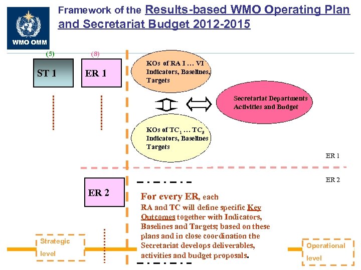 Results-based WMO Operating Plan and Secretariat Budget 2012 -2015 Framework of the WMO OMM (5) ST 1 (8) ER 1 KOs of RA I … VI Indicators, Baselines, Targets Secretariat Departments Activities and Budget KOs of TC 1 … TC 8 Indicators, Baselines Targets ER 1 ER 2 Strategic level For every ER, each RA and TC will define specific Key Outcomes together with Indicators, Baselines and Targets; based on these plans and in close coordination the Secretariat develops deliverables, activities and budget proposals. Operational level