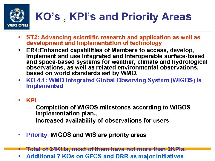 KO’s , KPI’s and Priority Areas WMO OMM • ST 2: Advancing scientific research and application as well as development and implementation of technology • ER 4: Enhanced capabilities of Members to access, develop, implement and use integrated and interoperable surface-based and space-based systems for weather, climate and hydrological observations, as well as related environmental observations, based on world standards set by WMO. • KO 4. 1: WMO Integrated Global Observing System (WIGOS) is implemented • KPI – Completion of WIGOS milestones according to WIGOS implementation plan. , – Increased availability of observations for users • Priority: WIGOS and WIS are priority areas • Total of 24 KOs, most of them have not more than 2 KPIs. • Additional 7 KOs on GFCS and DRR as major initiatives