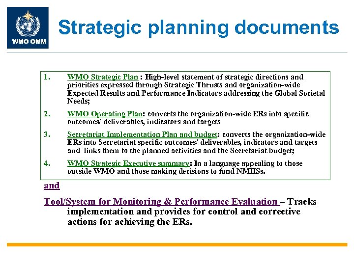 WMO OMM Strategic planning documents 1. WMO Strategic Plan : High-level statement of strategic directions and priorities expressed through Strategic Thrusts and organization-wide Expected Results and Performance Indicators addressing the Global Societal Needs; 2. WMO Operating Plan: converts the organization-wide ERs into specific outcomes/ deliverables, indicators and targets 3. Secretariat Implementation Plan and budget: converts the organization-wide ERs into Secretariat specific outcomes/ deliverables, indicators and targets and links them to the planned activities and the Secretariat budget; 4. WMO Strategic Executive summary: In a language appealing to those outside WMO and those making decisions to fund NMHSs. and Tool/System for Monitoring & Performance Evaluation – Tracks implementation and provides for control and corrective actions for achieving the ERs.