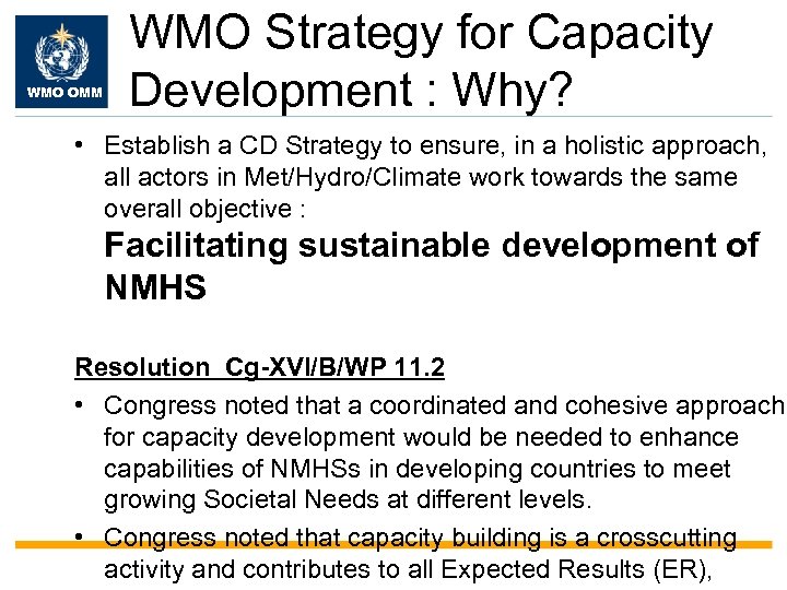 WMO OMM WMO Strategy for Capacity Development : Why? • Establish a CD Strategy to ensure, in a holistic approach, all actors in Met/Hydro/Climate work towards the same overall objective : Facilitating sustainable development of NMHS Resolution Cg-XVI/B/WP 11. 2 • Congress noted that a coordinated and cohesive approach for capacity development would be needed to enhance capabilities of NMHSs in developing countries to meet growing Societal Needs at different levels. • Congress noted that capacity building is a crosscutting activity and contributes to all Expected Results (ER),