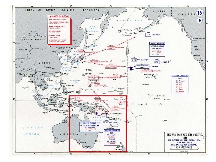 Centrifugal Advance • Japanese attacked Malaya, the Philippines, the Dutch East Indies, Wake, Guam…. • Instead of halting, establishing a defense, and pressuring the US to sue for peace (the prewar plan), the Japanese decided to extend their control over the Pacific planning operations in New Guinea near Port Moresby and against Midway (1, 300 miles northwest of Honolulu) • US achieved a moral victory with Doolittle’s Raid on the Japanese home islands on April 18, 1942 – Minimal damage but humiliated Japanese high command led them to advance the date for their attack on Midway