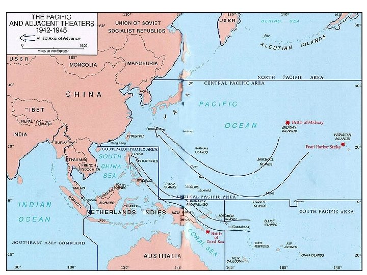 Pacific Theater and Selected Principles of War • Economy of Force – “Germany First” strategy made Pacific a secondary theater • Objective – Mac. Arthur strongly influenced by desire to return to the Philippines • Unity of Command – Interservice rivalry led to twin drives, one from the south Pacific and one across the central Pacific