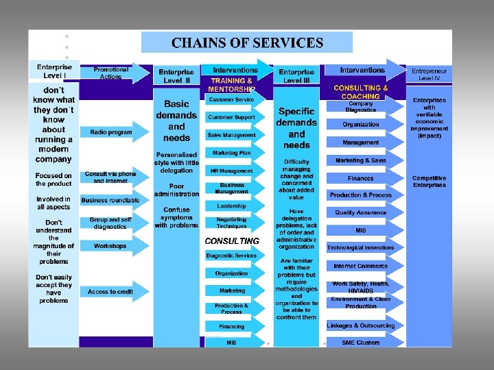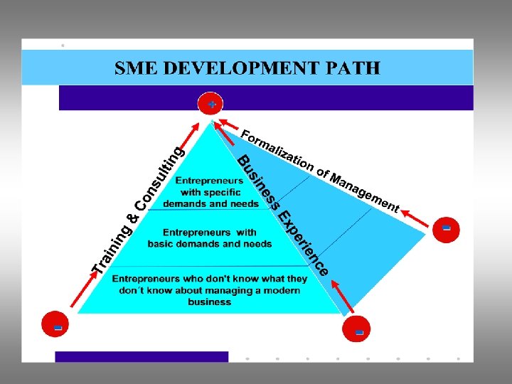 KEY FACTORS IN SME PERFORMANCE Enabling business environment and conditions (policies, legal, skills, infrastructure, etc) Access to market information, and opportunities (local and export) Small and Medium Enteprise Development Access to and cost of finance (risk finance, loans & working capital) Transparency, confidence, energy, vision Changes in knowledge attitudes and behaviour Access to and affordability of business development support services Improved strategies, processes, investment capacity & performance Increase in sales, profits and employment