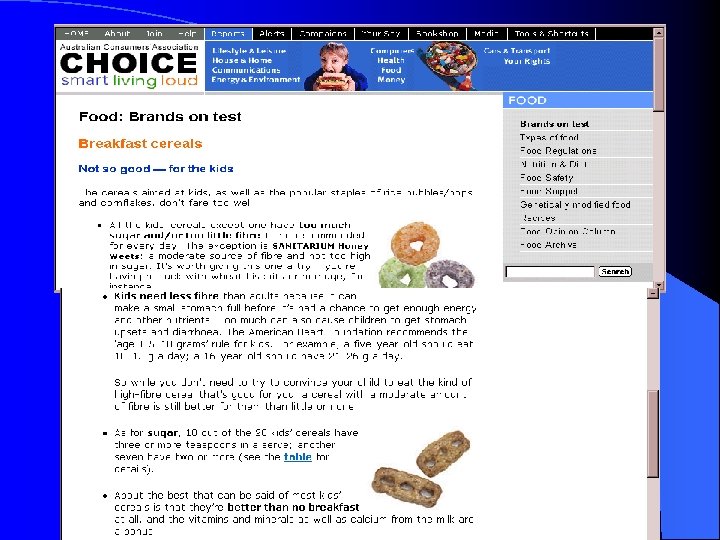 Cereals for kids l l l The cereals aimed at kids, as well as the popular staples of rice bubbles/pops and cornflakes, don’t fare too well. All the kids’ cereals except one have too much sugar and/or too little fibre to be recommended for every day. The exception SANITARIUM Honey Weets: a moderate source of fibre and not too high in sugar. It’s worth giving this one a try if you’re having no luck with wheat biscuits or porridge, for instance. Kids need less fibre than adults because it can make a small stomach full before it’s had a chance to get enough energy and other nutrients. Too much can also cause children to get stomach upsets and diarrhoea. As for sugar, 10 out of the 20 kids’ cereals have three or more teaspoons in a serve; another seven have two or more (see the table for details). About the best that can be said of most kids’ cereals is that they’re better than no breakfast at all, and the vitamins and minerals as well as calcium from the milk are a bonus. Apart from cereals for kids, most brands of cornflakes and rice bubbles are low in fibre and high in salt — not the best choice as anyone’s staple.