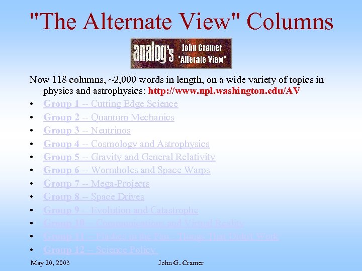 "The Alternate View" Columns Now 118 columns, ~2, 000 words in length, on a wide variety of topics in physics and astrophysics: http: //www. npl. washington. edu/AV • Group 1 -- Cutting Edge Science • Group 2 -- Quantum Mechanics • Group 3 -- Neutrinos • Group 4 -- Cosmology and Astrophysics • Group 5 -- Gravity and General Relativity • Group 6 -- Wormholes and Space Warps • Group 7 -- Mega-Projects • Group 8 -- Space Drives • Group 9 -- Evolution and Catastrophe • Group 10 -- Communications and Virtual Reality • Group 11 -- Flashes in the Pan - Things That Didn't Work • Group 12 -- Science Policy May 20, 2003 John G. Cramer