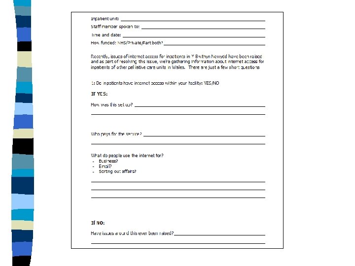 Aims n To look at the provision and use of the internet for palliative care inpatients in specialist palliative care units in Wales n Ultimately to find a solution for patient D