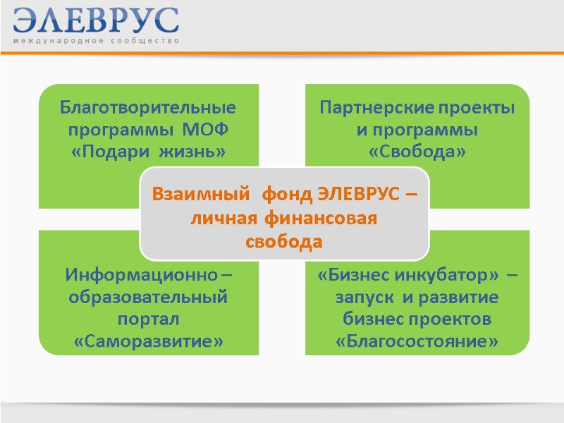 Статусы участников Фонда и премиальная программа поддержки Преимущества Международного сообщества (МС) ЭЛЕВРУС: ЭЛЕВРУС это: международный глобальный проект, он доступен во всех странах мира; имеет профессиональное математическое обоснование и аналитическую платформу, учитывающие динамику развития и роста проекта; предлагает участникам оптимальные финансовые решение в области платежных систем и интернет банкинга, включая систему внутренних международных переводов; предлагает современную и эффективную программу обучения и карьерного роста; имеет специальную бонусную систему для руководителей различных уровней; обеспечивает постоянное развитие и совершенствование проекта (краудфандинг, бизнес-инкубатор – развитие самых эффективных франчайзинговых моделей, образовательные программы в различных сферах, благотворительность и многое другое).