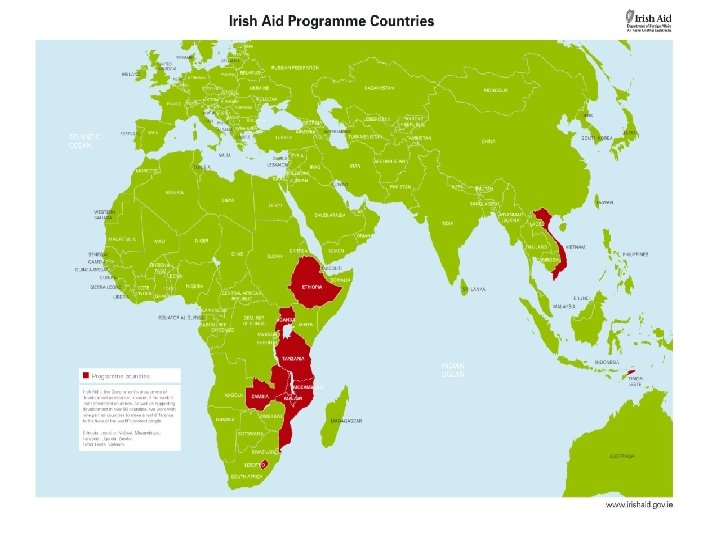 Overview Who ? • • Irish Aid is the Government’s programme of overseas development assistance (ODA) to the poorest countries in the world Development Cooperation – one of high level objectives of Ireland’s foreign policy • • Official development assistance programme since 1974. ODA this year: € 696 million or 0. 48% of GNP. 2008 ODA: 921 million (0. 56) Aim: to fight global poverty. Why ? • • • moral obligation - our self-interest - commitments via membership of - UN, EU Ireland’s commitment to efforts to reach the Millennium Development Goals We received aid from EU.