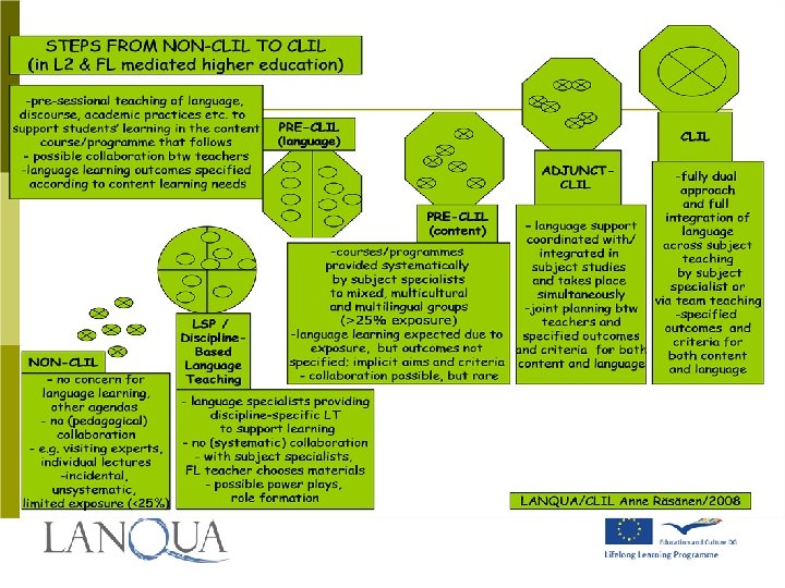 ? ? ? Preliminary Questions • • • What are the reasons for implementing a language/cultureintegrated approach? Is there a planned/staged-out approach to implementation? At what levels of education (e. g. BA, MA, Ph. D, CPD)? Are these full-size L 2 mediated programmes or modules offered systematically? What subjects/domains are most likely to take up a new approach? Are learning outcomes specified for both language and content? Is there coordination between language-specialists and subjectspecialists (e. g. joint planning of syllabus and learning outcomes, team teaching)? How are students’ needs dealt with vis-à-vis FL education? How are educators’ needs dealt with?